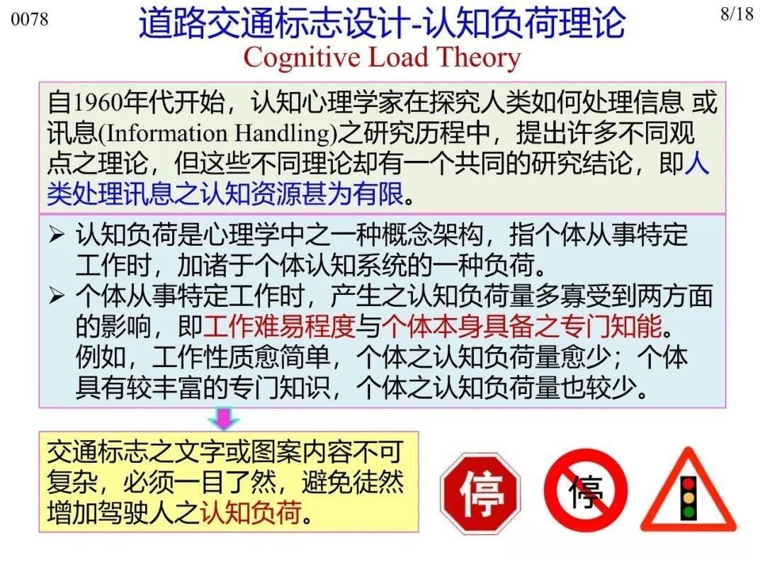 6)认知负荷理论(Cognitive Load Theory):驾驶人在驾驶过程中处理信息的认知资源极为有限,因此交通标志的文字、图符都应一目了然,避免突然增加驾驶人的认知负荷;