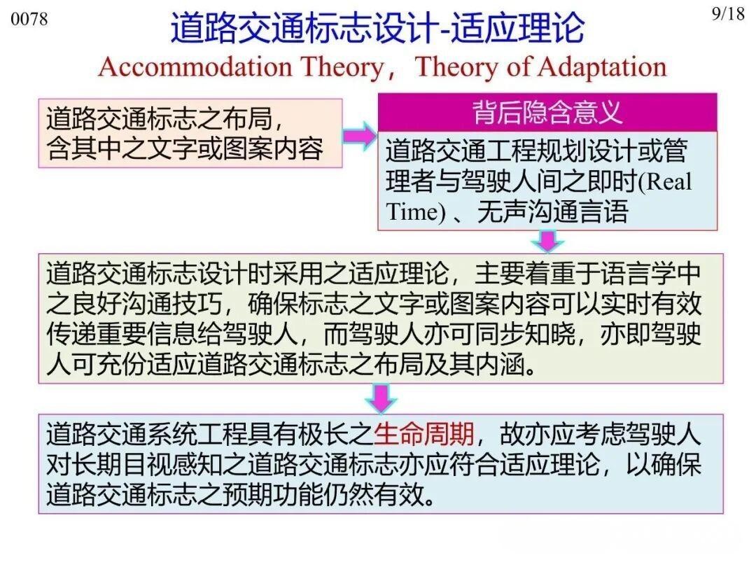 7)适应理论(Accommodation Theory):标志是无声的信息传递工具,应保障信息及时传递,保证驾驶人长期适应标志传递的信息;