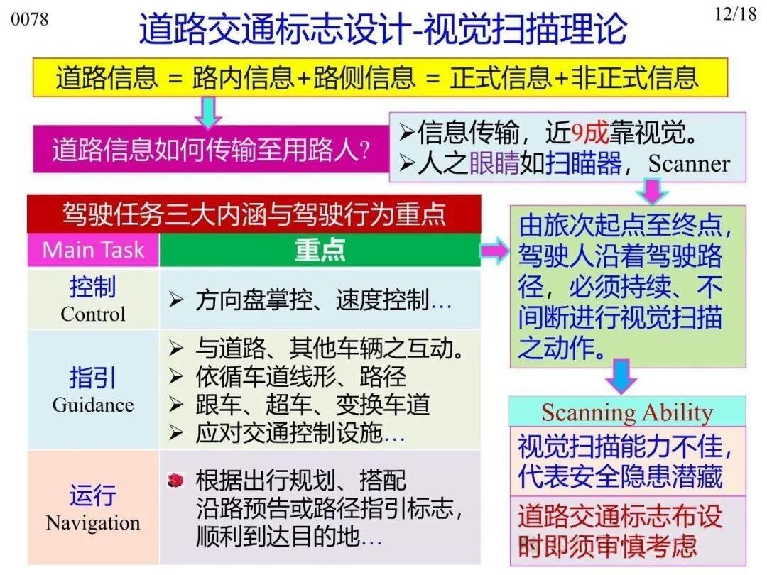 10)视觉扫描理论:道路信息的传输近90%依赖视觉,视觉扫描能力弱意味着潜在的安全隐患,因此道路交通标志布设时需审慎考虑驾驶人的视觉扫描能力;