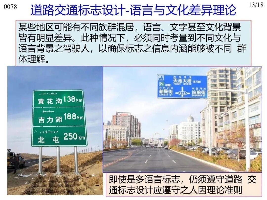 11)语言与文化差异理论:针对多民族混居、语言文字及文化背景存在明显差异的地区,设计时应考虑不同文化与语言背景的驾驶人,采用多语言标志,确保标志的信息内涵能被各类群体理解。同时,也要严格遵守标志设计应遵循的人因理论,不可因语言差异忽视设计规范;