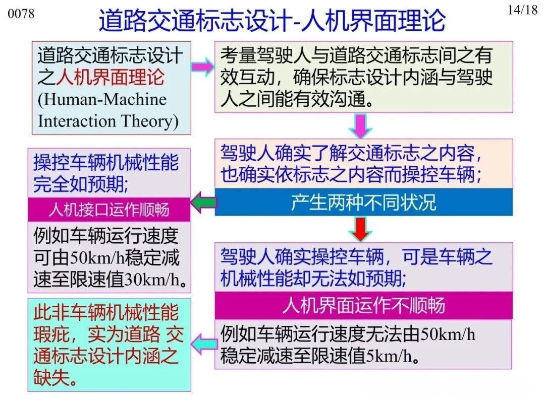 12)人机交互理论(Human-Machine Interaction Theory): 驾驶人与道路交通标志需有效互动,确保驾驶人理解标志,并以此为据操控车辆。“人机界面顺畅”是指驾驶人控车时,车辆机械性能符合预期。需避免:一是驾驶人操控车辆,车辆机械性能达不到预期;二是标志设计缺失,导致驾驶人未按安全要求操控车辆,而不是车辆机械性能达不到安全要求;