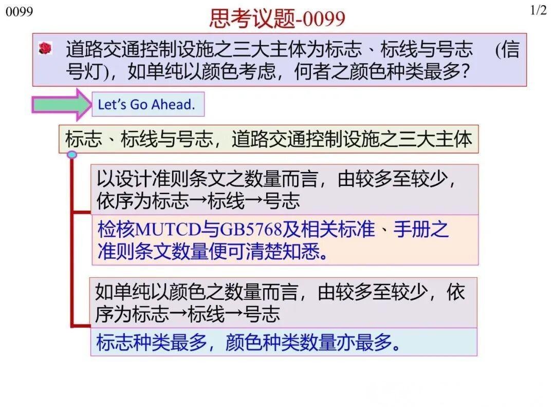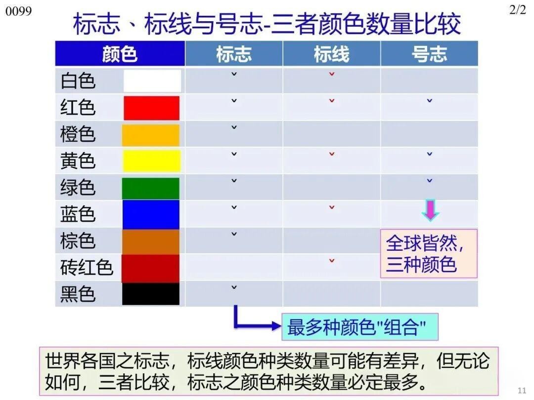 道路交通控制设备的三大主体为标志、标线与交通信号灯。从MUTCD、GB5768 及相关标准手册条文数量看,排序为标志>标线>交通信号灯。颜色种类数量上,排序同样是标志>标线>交通信号灯。标志涉及白色、红色等 8种颜色,且有最多种颜色组合;标线有白色、红色等 5 种颜色;交通信号灯则是全球通用的红、黄、绿3种颜色。