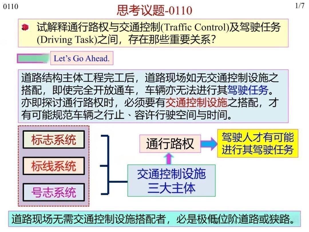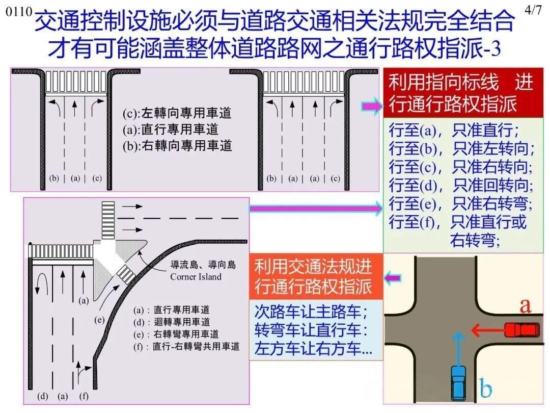 通行路权的规范需以交通控制为支撑。道路主体工程完工后,若无交通控制设备(标志、标线、信号灯三大主体)搭配,车辆无法规范行驶,通行路权也难以明确,仅极低位阶道路或狭路因功能简单、流量小可例外。但单一设备无法承担全路网路权分配的功能,路网规模大且功能位阶不同,部分场景(如无信号控制、无标志标线的交叉路口)需结合道路交通法规,形成“设备+法规”的完整系统,才能完整实现全路网通行路权合理分配。