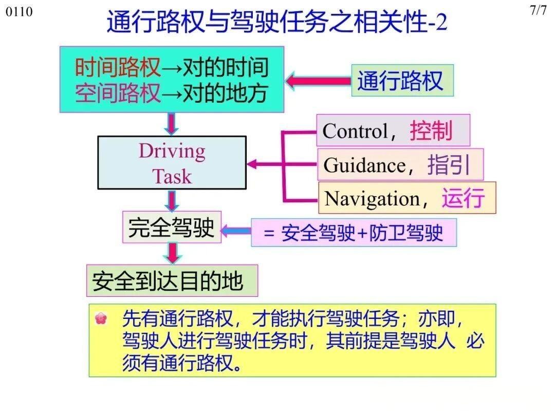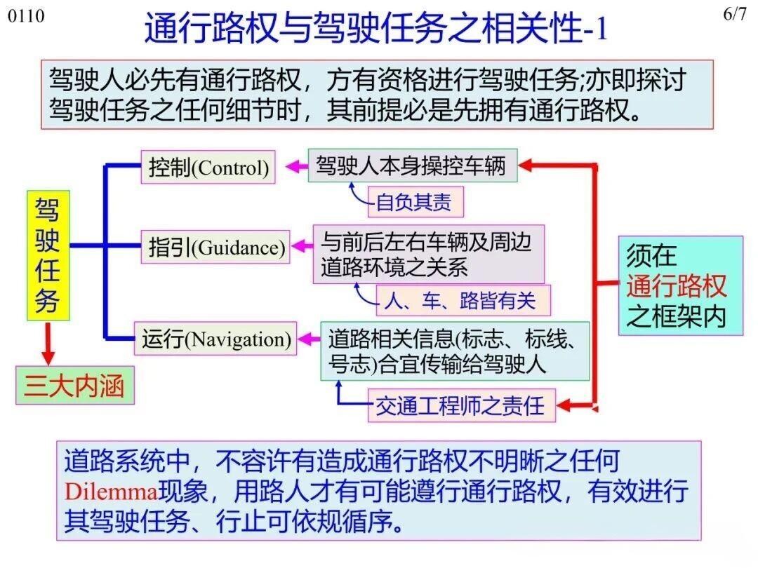 通行路权是驾驶任务的前置条件,驾驶人需先拥有路权(含时间与空间路权),才能开展驾驶任务。驾驶任务的控制(Control)、指引 (Guidance,及时反应)、运行(Navigation,指引)三大内涵,均需在路权框架内执行:控制(Control)环节驾驶人操控车辆需以有路权为前提且自负其责;指引(Guidance,及时反应)环节需依路权优先级处理与周边的关系;运行(Navigation,指引)环节则通过接收道路信息确认路权范围。