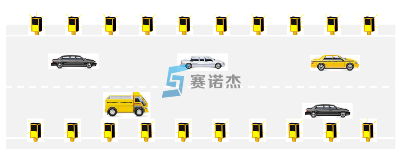 防止追尾警示模式:能见度<200m,车辆经过时,在车后一段距离黄灯闪烁转换成红色常亮,形成一段红色尾迹,警示后车;